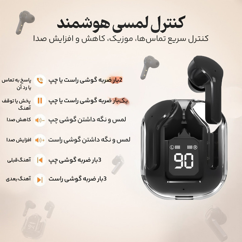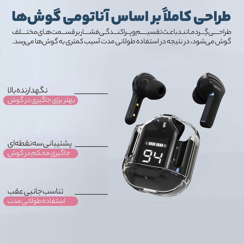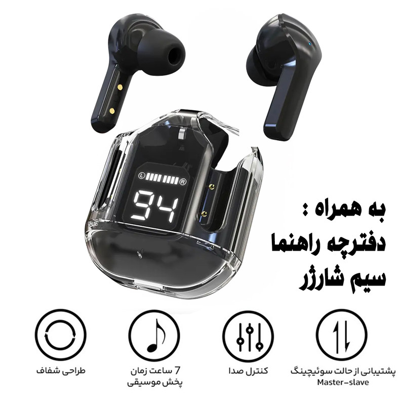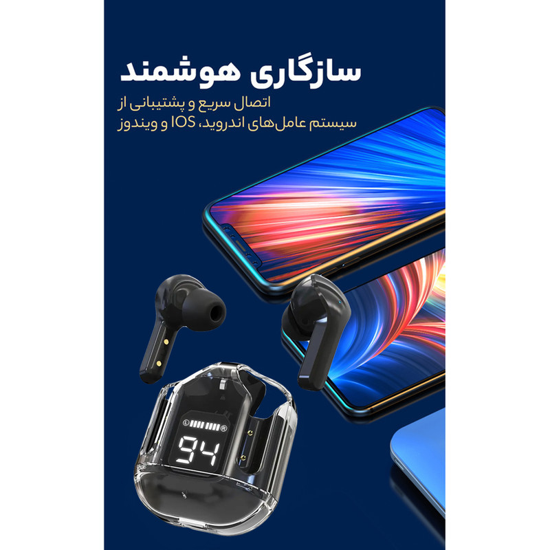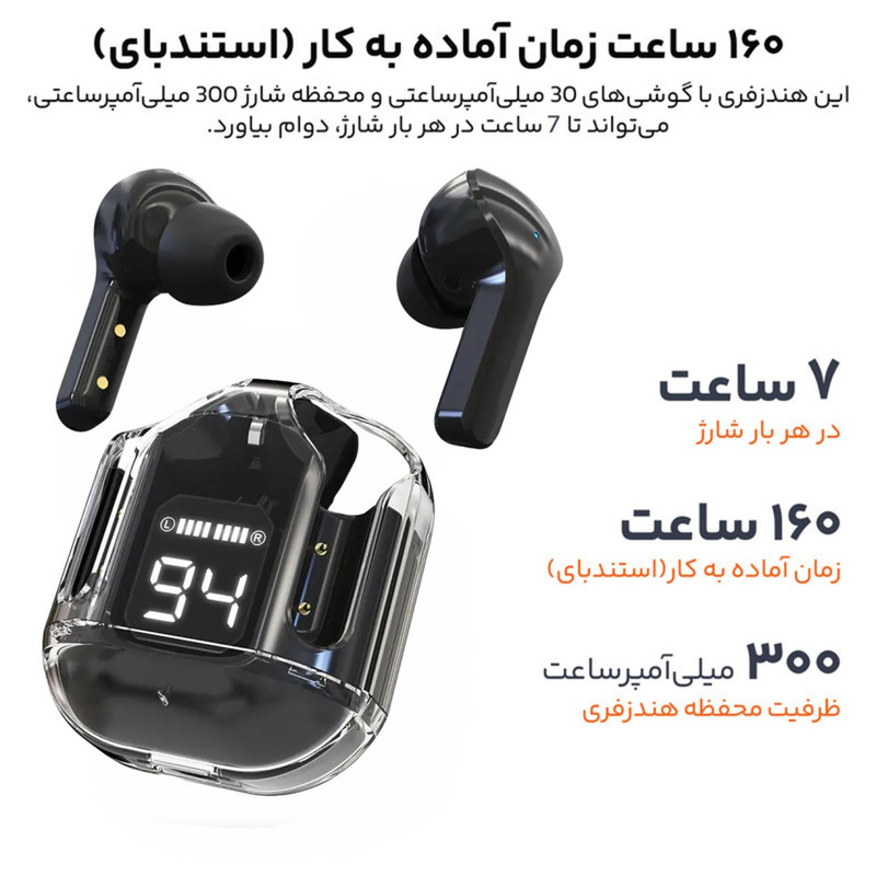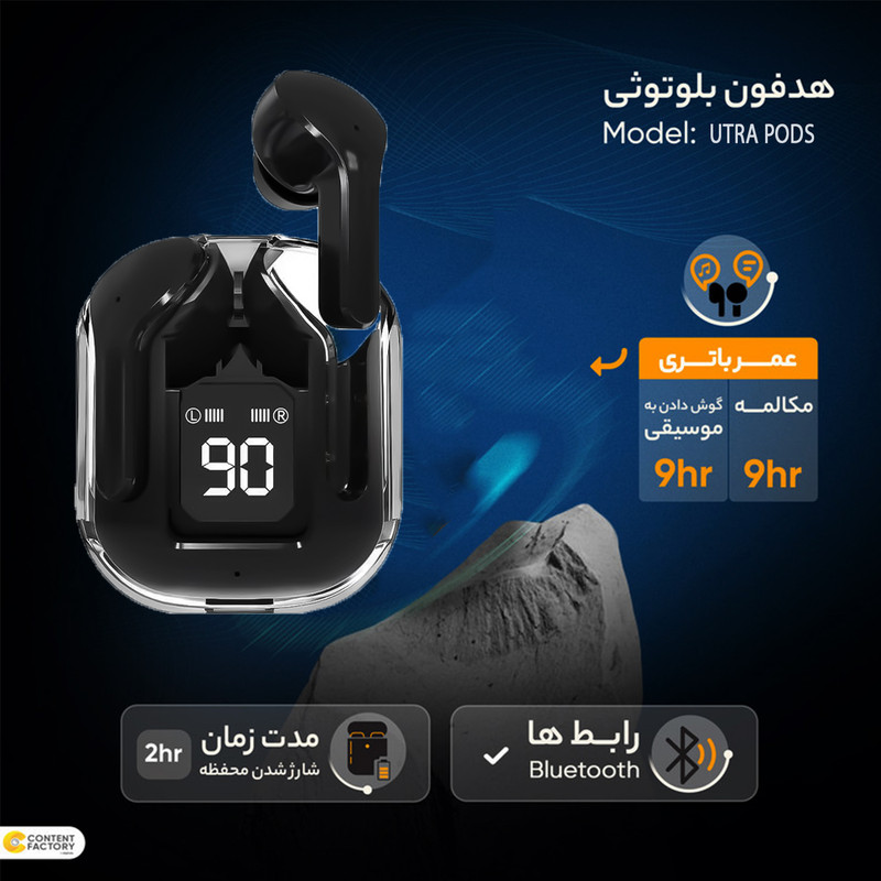 هدفون بلوتوثی مدل Ultra Podsبا ظاهر زیبا و ظریف، محصولی مناسب و یک هدیه عالی برای نزدیکانتان به شمار میرود. هدفونهای True Wireless Stereo که مدل ultra pods هم یکی از آنها به شمار میرود، میتوانند کیفیت صدای فوقالعادهای را با باس عمیق و تریبل شفاف تولید کنند. صدای استریو Hi-Fi و تماسهای واضح، گوشیهای بلوتوثی بیسیم و بلندگوهای 6 میلیمتری، به همراه بیس قوی، شفاف، متعادل و عملکرد سه برابری برای بازتولید زنده صدای دریافتی و ارسالی از جمله ویژگیهای این هدفون هستند. هدفون بلوتوثی مدل Ultra pods دارای فناوری حذف نویز CVC8.0 است که موسیقیهای آرام و تماسها را در محیطهای پر سر و صدا قابل شنیدن میکند. محفظه شارژ این هدفون دارای باتری قدرتمند 2000 میلیآمپر ساعتی بوده و ظرفیت باتری گوشیهای آن معادل 50 میلیآمپر ساعت است. این باتری تا 750 ساعت در حالت زمان آماده به کار (استندبای) قابلیت شارژدهی دارد و زمان مکالمه و پخش موسیقی آن نزدیک به 9 ساعت با هر بار شارژ است. این هدفون بلوتوثی دارای قابلیت سوئیچ MASTER-SLAVE است که با این قابلیت میتوانید بهطور جداگانه از هر گوشی بهعنوان گوشی اصلی استفاده کنید. خروجی صدای گوشیها هم بسیار واضح، شفاف، متعادل و دارای بالانس بسیار مناسب و استاندارد است. در نهایت، طراحی انحنادار کویل و ساختار با کیفیت اجزای آکوستیک این هدفون باعث میشوند تا صدایی غنی و خالص را تجربه کنید.